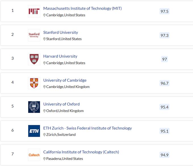 Ba đại học MIT, Stanford, Harvard của Mỹ đứng đầu tiên, còn lại đa số của Anh và một trường của Thụy Sĩ. Châu Á không có đại diện trong top 10.