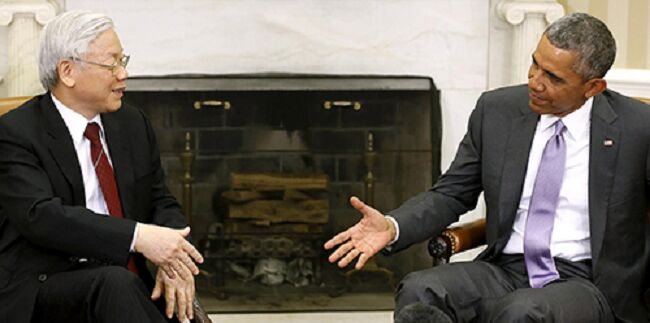 Tổng Bí thư Nguyễn Phú Trọng hội đàm cùng Tổng thống Hoa Kỳ Barack Obama tại Nhà Trắng trong chuyến thăm chính thức Hoa Kỳ vào tháng 7/2015 (Nguồn: Reuters)