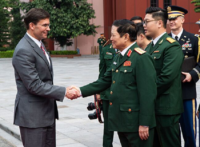 Bộ trưởng Quốc phòng Hoa Kỳ Mark Esper cùng Bộ trưởng Quốc phòng Việt Nam Ngô Xuân Lịch trong chuyến thăm chính thức Việt Nam vào tháng 11/2019 (Ảnh: Minh Quân)