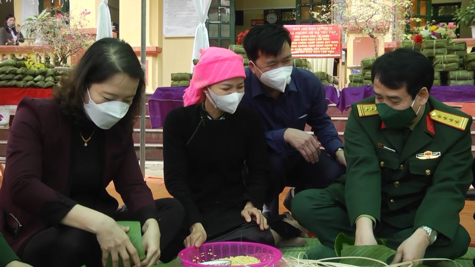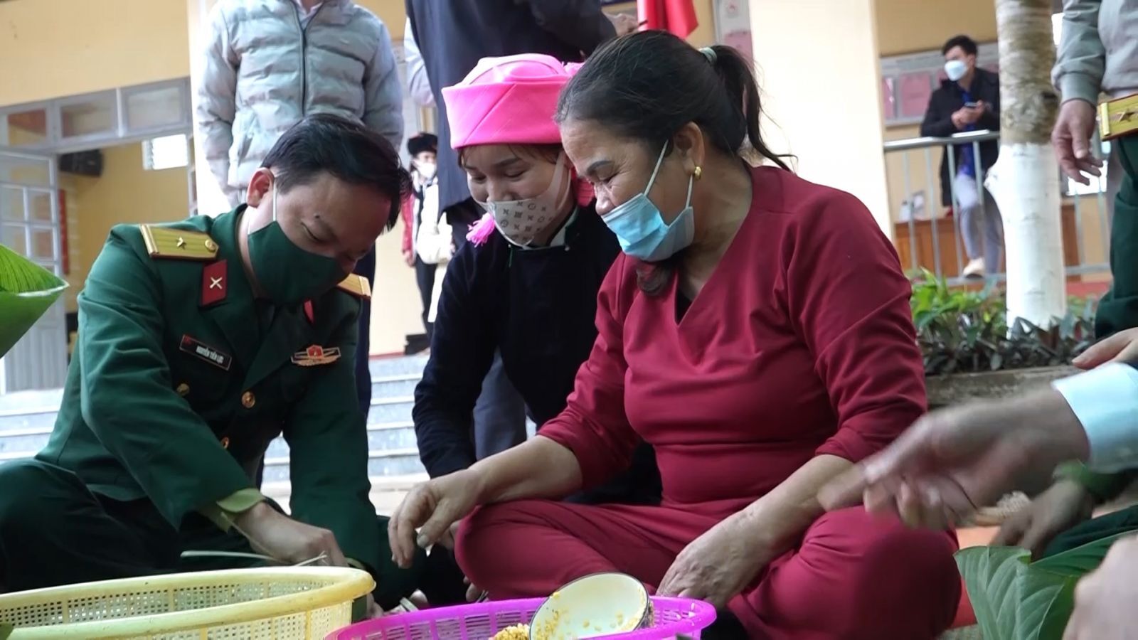 Lãnh đạo huyện Văn Yên và Bộ chỉ huy quân sự tỉnh Yên Bái cùng bà con gói bánh chưng