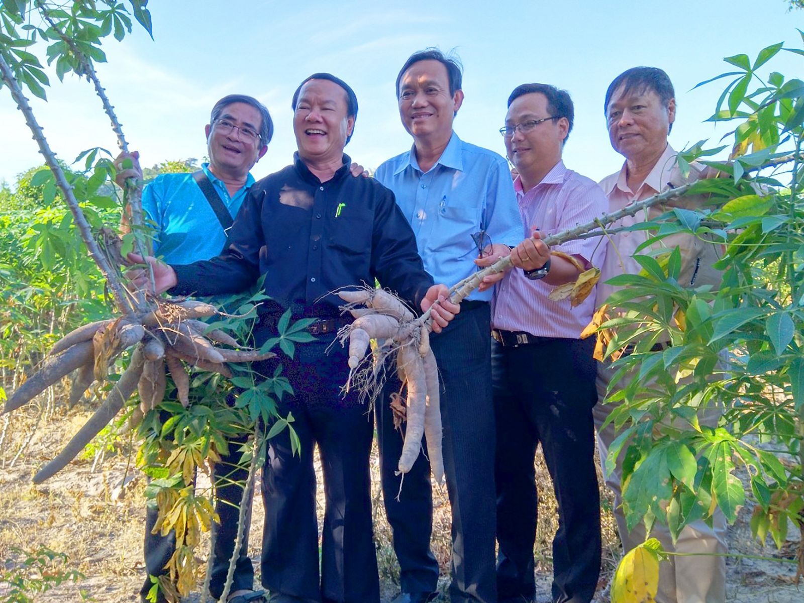 Ông Nguyễn Sĩ Lâm - Giám đốc Sở Nông nghiệp & PTNT An Giang (giữa) cùng ông Lê Thanh Thuấn - TGĐ Tập đoàn Sao Mai (thứ 2, từ trái qua) phấn khởi trước vụ mì “nặng ký”.