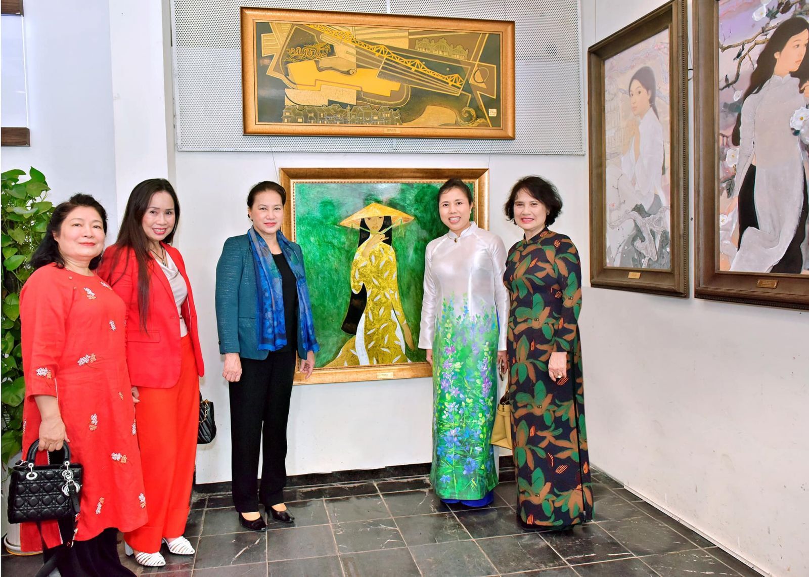 Chủ tịch Quốc hội Nguyễn Thị Kim Ngân bên bức tranh sơn mài thiếu nữ Hà Nội của họa sỹ Công Quốc Hà