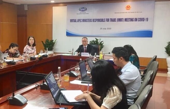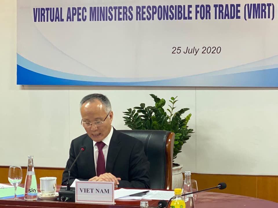VNHN - Ngày 25/7, Hội nghị Bộ trưởng Thương mại APEC trực tuyến (VMRT) về Covid-19 đã diễn ra dưới sự chủ trì của Bộ trưởng Ngoại thương và Công nghiệp Malaysia, Mohamed Azmin Ali. Thứ trưởng Bộ Công Thương Trần Quốc Khánh dẫn đầu đoàn đại biểu Việt Nam tham dự Hội nghị.