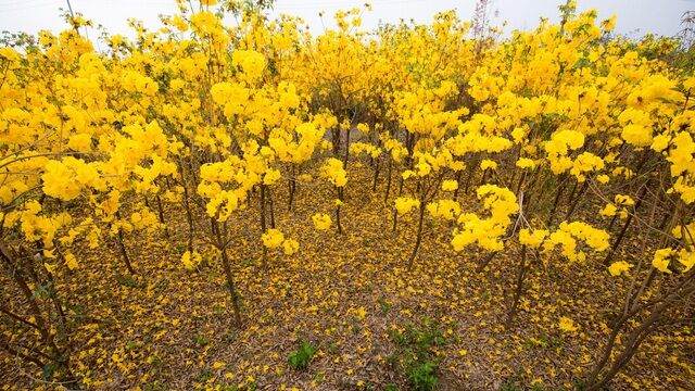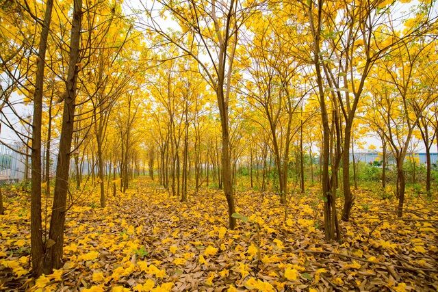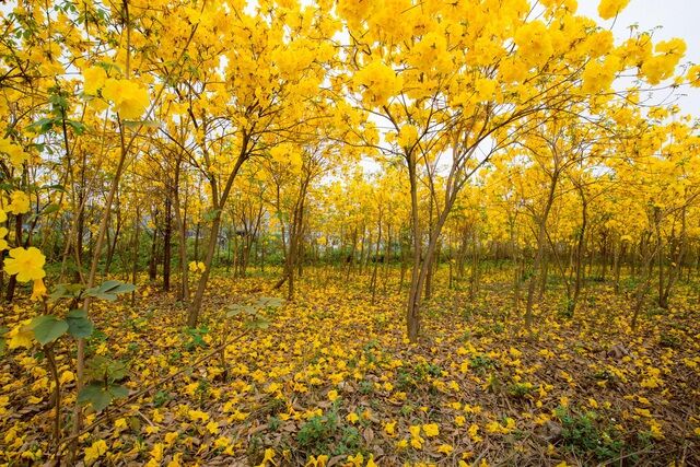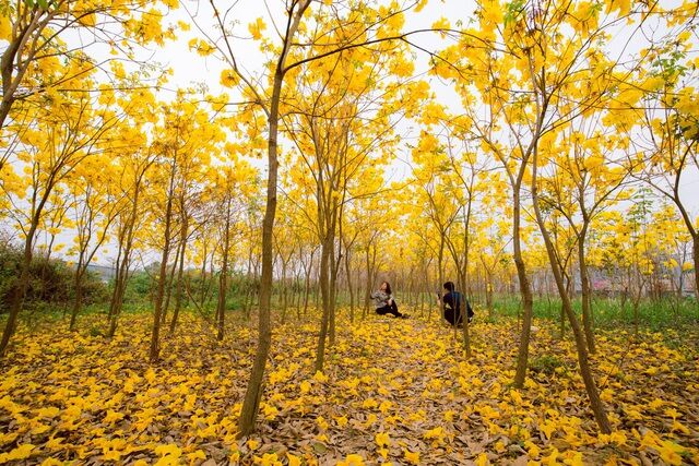 Hàng nghìn cây phong linh bung nở hoa vàng rực rỡ tạo khung cảnh đẹp thơ mộng như phim, thu hút đông đảo du khách tới tham quan, chụp hình.
