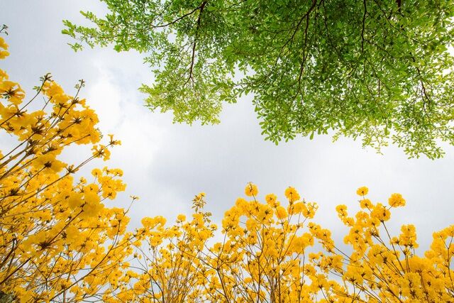 Vào mùa khô cây bắt đầu rụng hết lá và nở hoa, tỏa sắc vàng rực rỡ trông rất đẹp mắt. Những bông hoa có kích thước khá lớn, hình dáng tựa như chiếc chuông, màu vàng tươi.