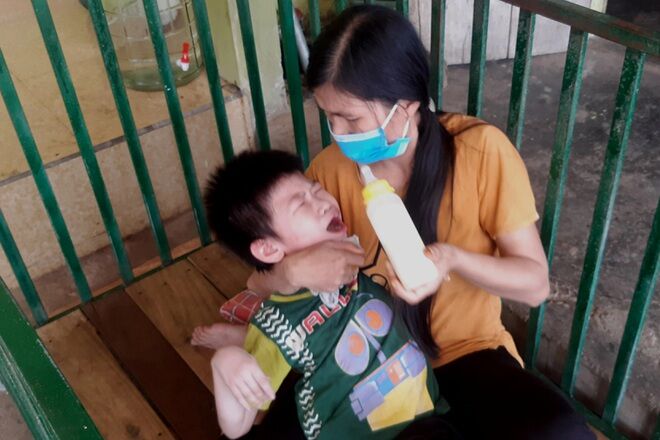 Cháu Chu Đình Hùng mắc bệnh viêm não phải nằm một chỗ đã 9 năm nay.