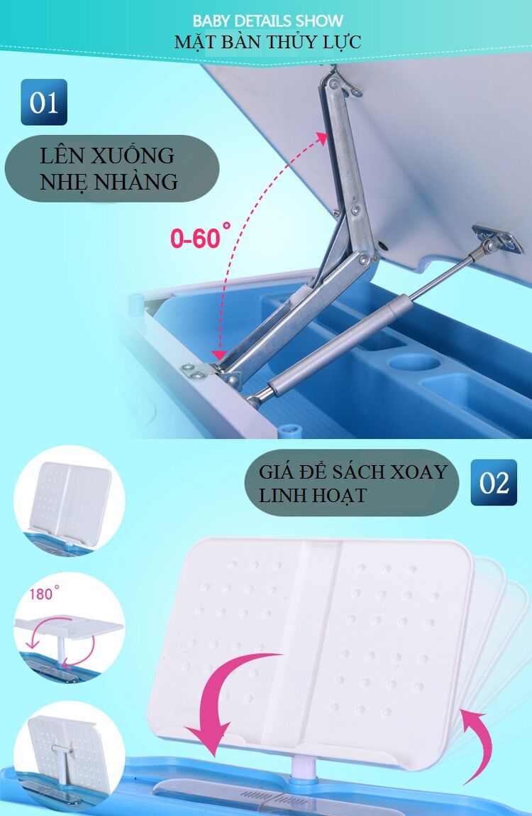 + Điểm khác biệt đầu tiên của bàn ghế thông minh với loại bàn thông thường là có thể điều chỉnh chiều cao theo độ tuổi các con, sử dụng thủy lực nên việc sử dụng rất nhẹ nhàng.