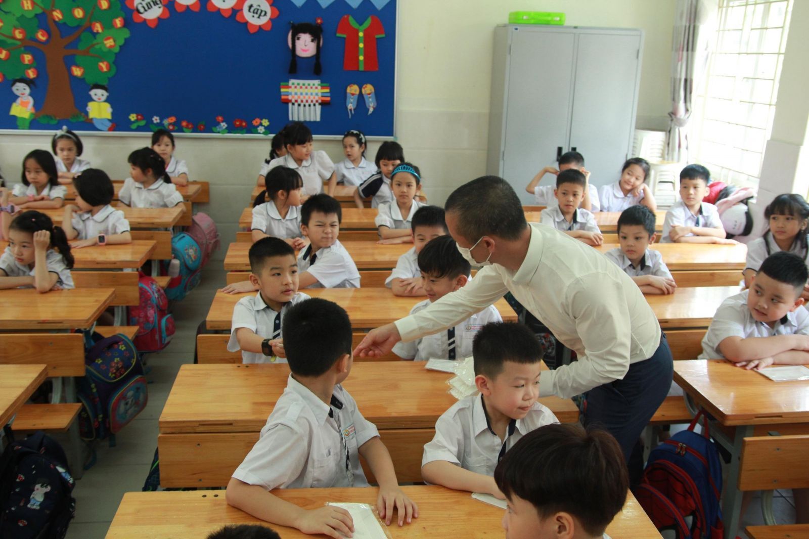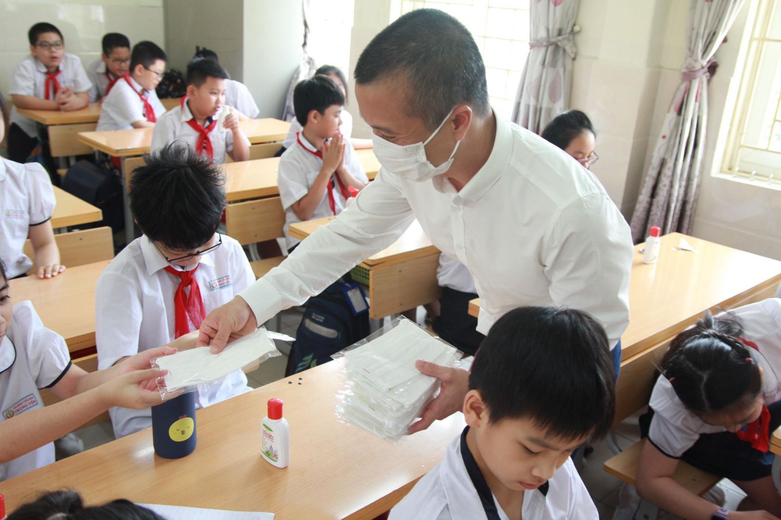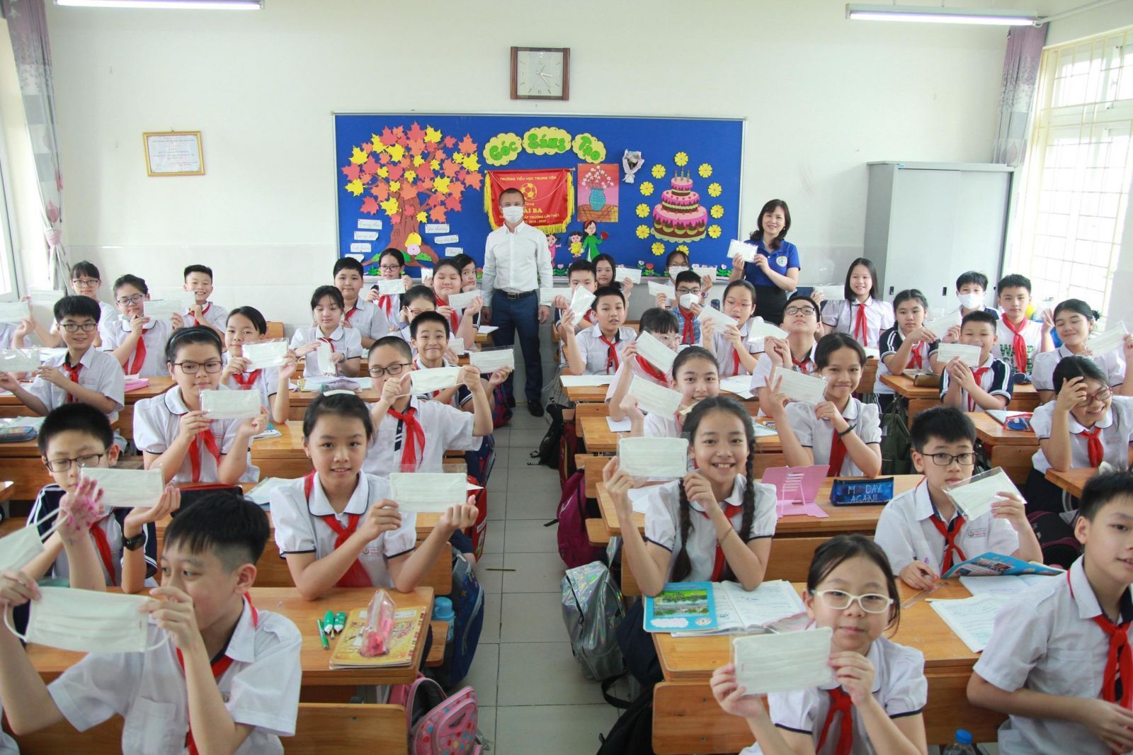 Cô và trò Trường Tiểu học Trung Yên vui mừng nhận khẩu trang trong ngày đầu quay trở lại trường.