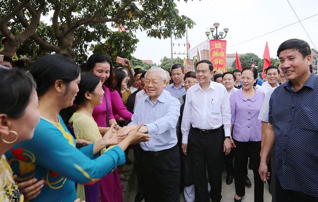 Tổng Bí thư, Chủ tịch nước Nguyễn Phú Trọng và Bí thư Trung ương Đảng, Chủ tịch Ủy ban Trung ương Mặt trận Tổ quốc Việt Nam Trần Thanh Mẫn tham dự Ngày hội Đại đoàn kết toàn dân tộc với nhân dân xã Vinh Quang (huyện Vĩnh Bảo, thành phố Hải Phòng), tháng 11-2017 _Ảnh: TTXVN