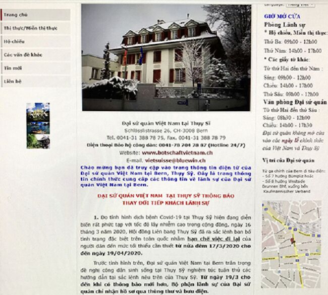 ĐSQ Việt Nam tại Thụy Sỹ thường xuyên cập nhật thông tin về tình hình dịch Covid-19, số điện thoại bảo hộ công dân, khuyến cáo công dân về tình hình dịch bệnh trên website của ĐSQ (Nguồn: baoquocte.vn)