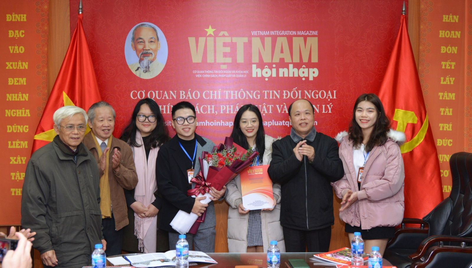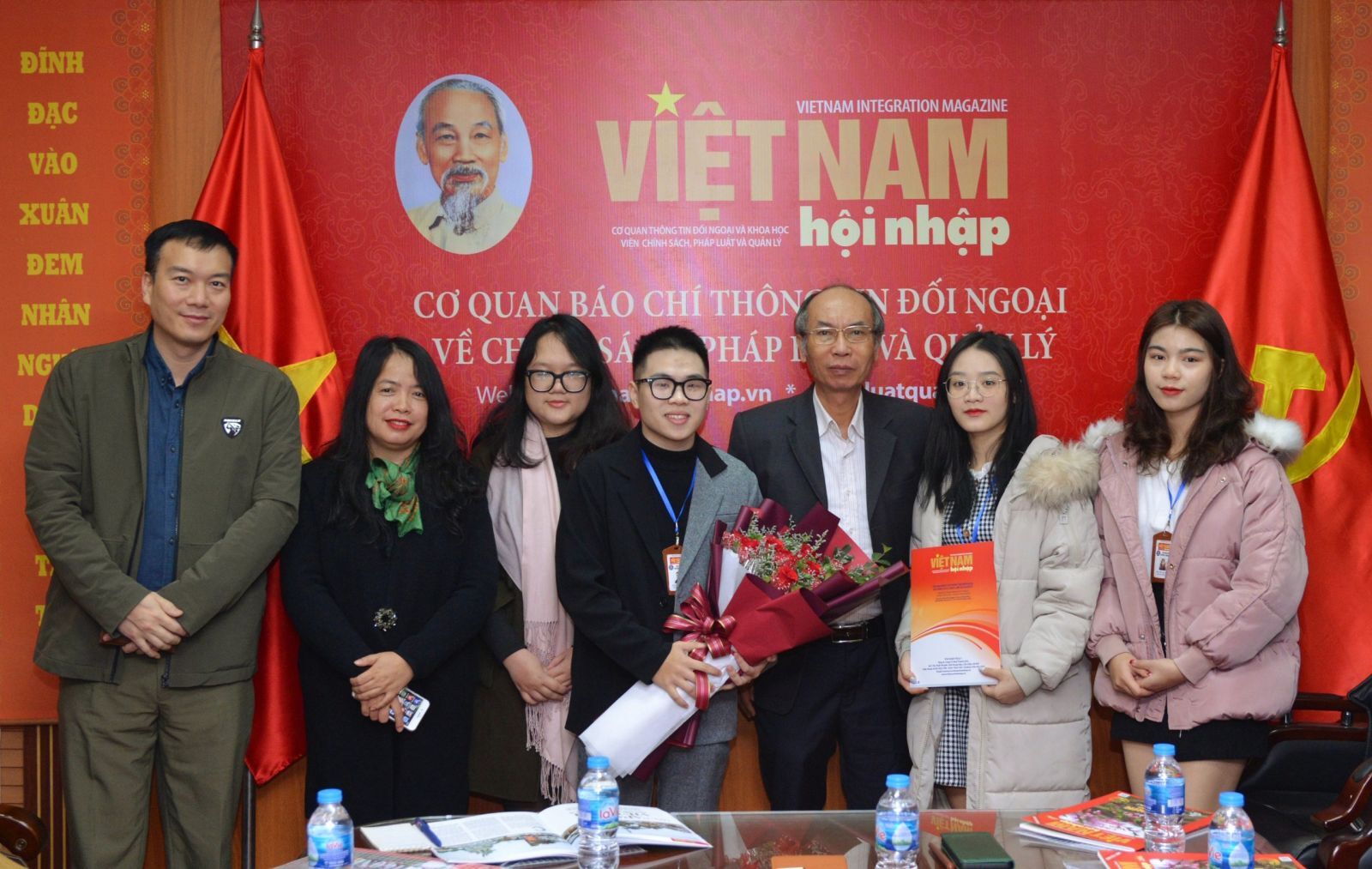 Lãnh đạo Viện Chính sách, Pháp luật và Quản lý và Tạp chí Việt Nam hội nhập - Cơ quan bảo trợ trao Quyết định bảo trợ và tặng hoa cho đại diện CLB Báo chí Truyền thông trẻ PR LAB