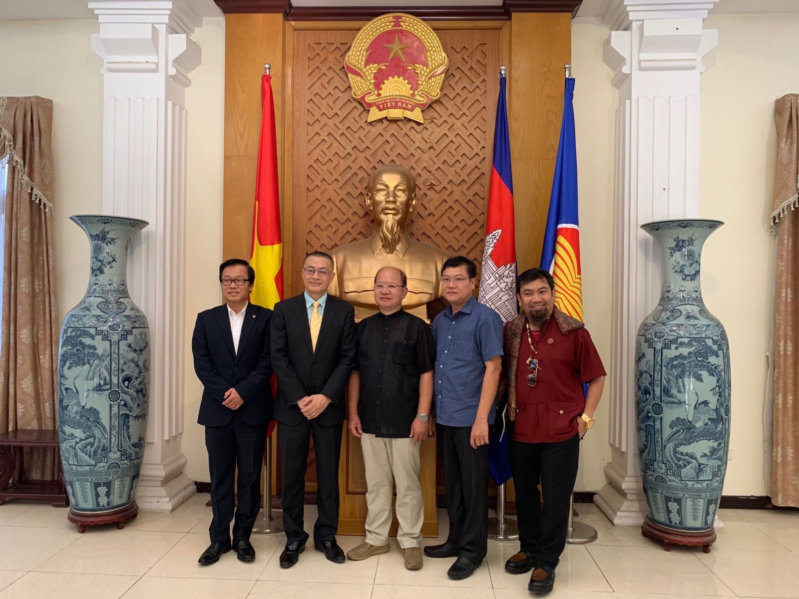 Doanh nhân Nguyễn Hoàng Sang chụp ảnh lưu niệm cùng với Đại sứ Việt Nam tại Campuchia Vũ Quang Minh (thứ 2 từ trái sang) và Chủ tịch Liên hiệp UNESCO Việt Nam Nguyễn Xuân Thắng (giữa) tại Campuchia.