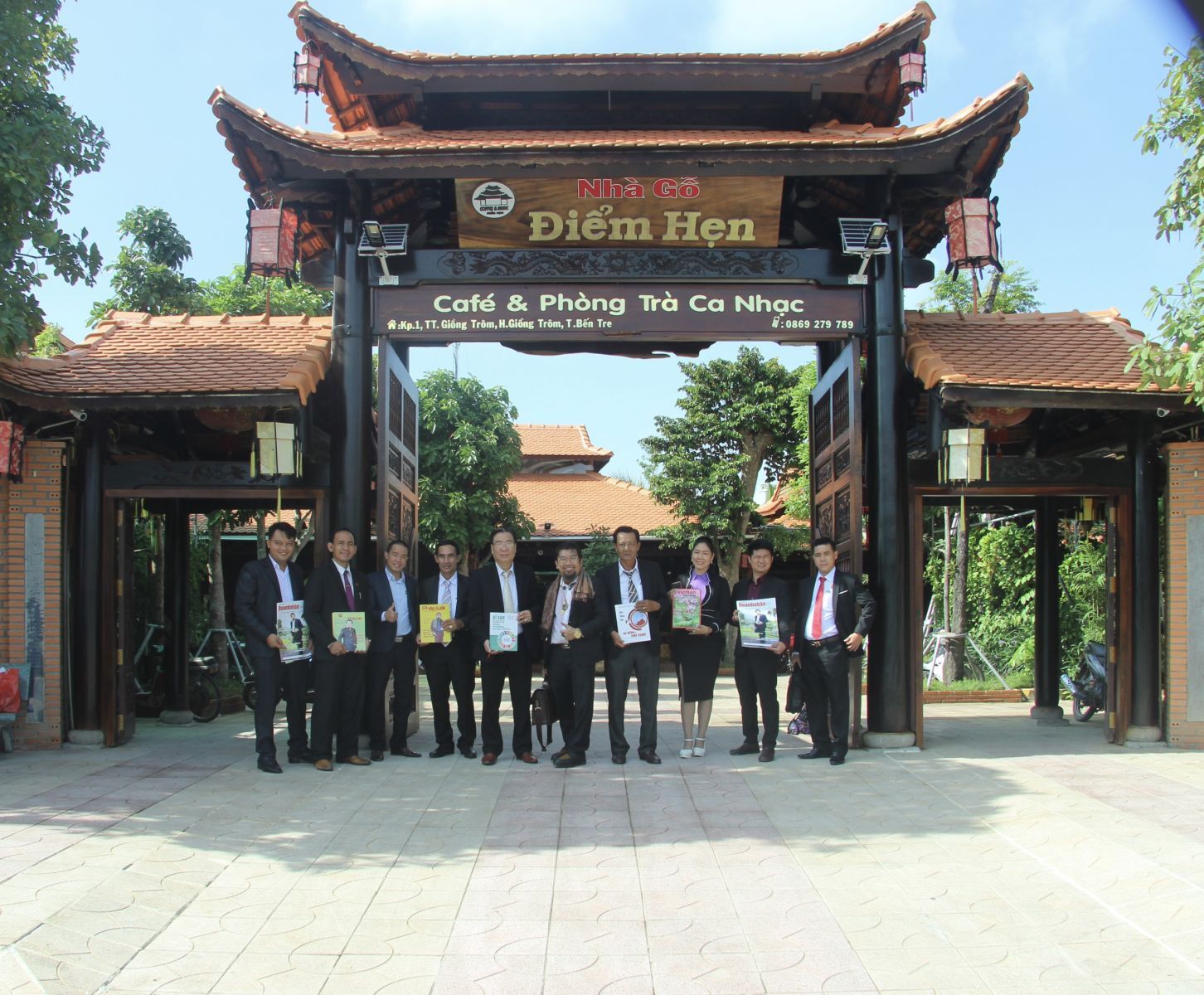 Ông Trương Duy Hải - Nguyên Phó Chủ tịch UBND tỉnh Bến Tre cùng cùng DN Nguyễn Hoàng Sang (bìa trái), trao quà lưu niệm cho DN Phạm Văn Út - Giám đốc Công ty TNHH Minh Phú Châu (bìa phải).