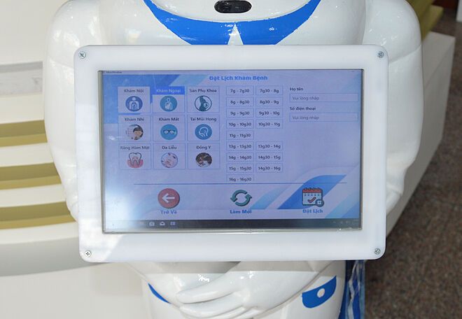 Phía trước ngực robot có bảng điện tử, tra cứu danh mục viện phí, đặt lịch hẹn khám bệnh.
