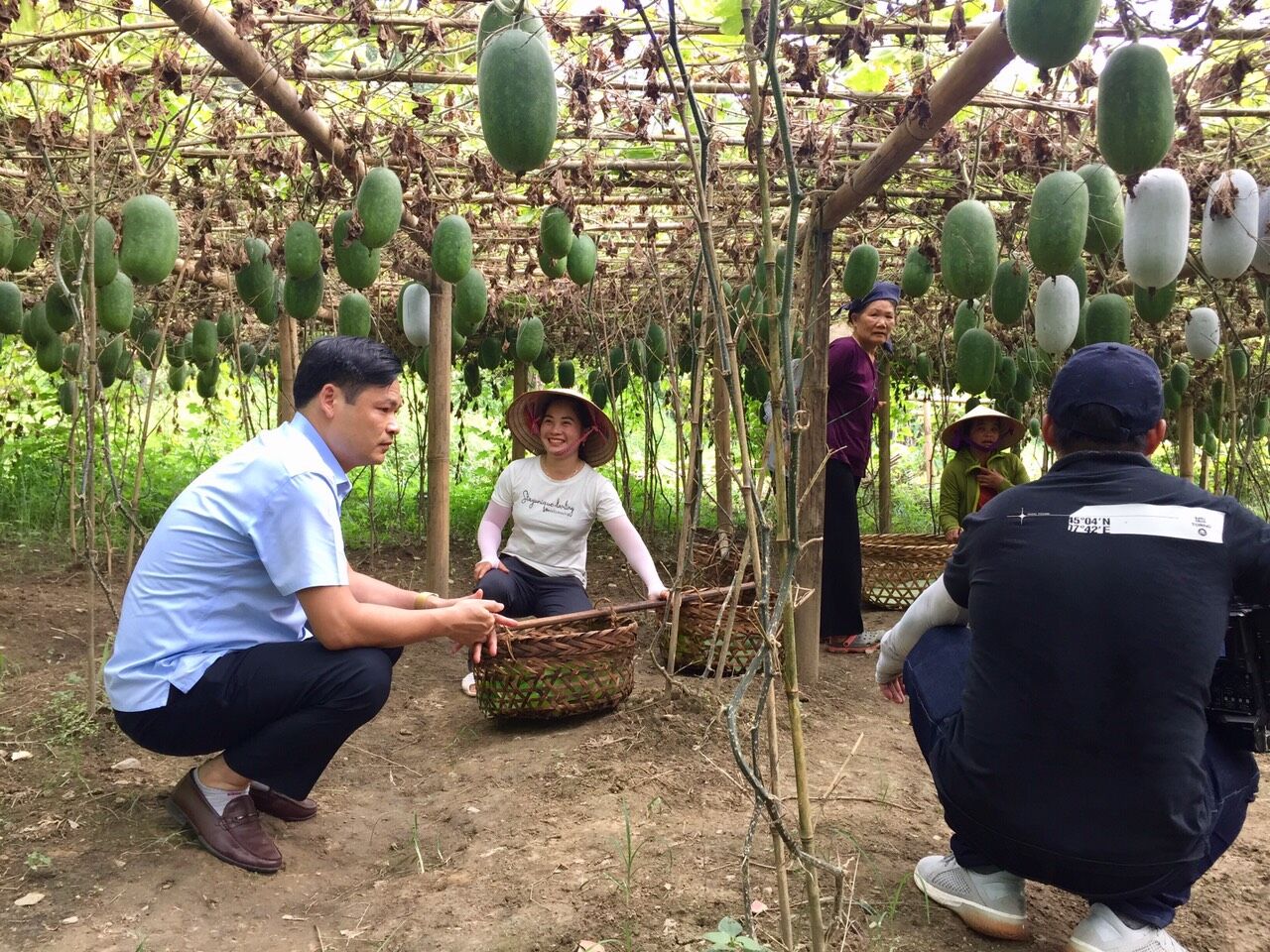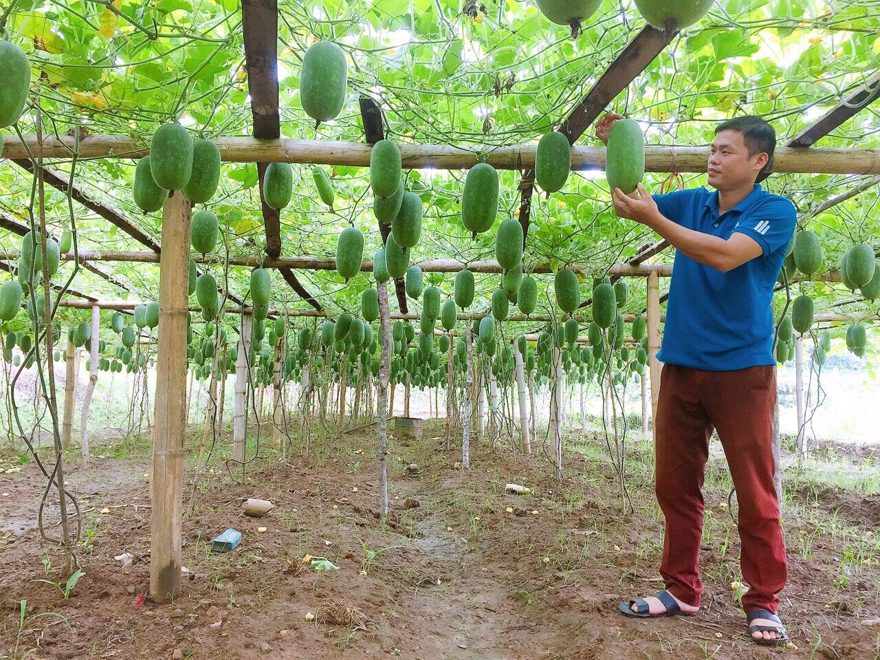 Ông Triệu Văn Cường - Chủ tịch UBMTTQ xã Địa Linh thăm ruộng vườn bí tại thôn Tiền Phong.