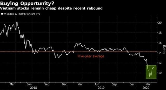 VNHN - VN-Index đã phục hồi 15% kể từ đầu tháng 4, trở thành chỉ số diễn biến tốt nhất trên thế giới, theo số liệu của Bloomberg. Trước đó, VN-Index giảm 25% trong tháng 3 do lo ngại về tác động của virus corona. Chỉ số này đang được giao dịch ở 11 lần lợi nhuận ước tính năm sau, thấp hơn mức trung bình 5 năm 14 lần.