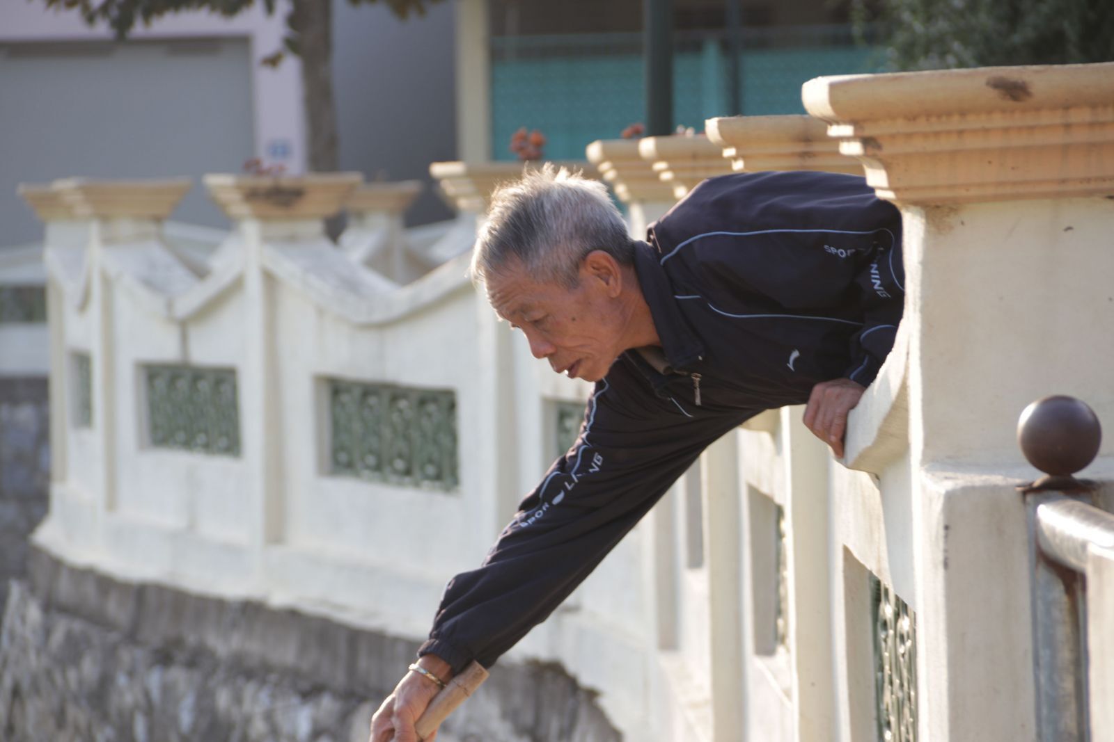 Tuổi già nhưng ông Hùng vẫn cố gắng vớt rác thải dưới hồ để giữ hồ sạch sẽ hơn.