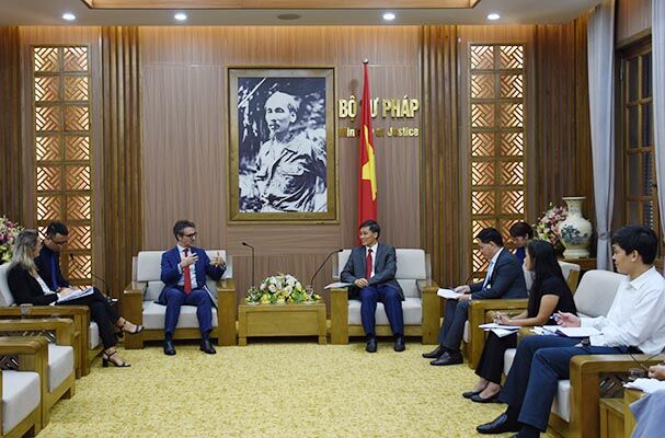 Thứ trưởng Bộ Tư pháp Nguyễn Khánh Ngọc tiếp đón ông Giorgio Aliberti, Đại sứ - Trưởng Phái đoàn Liên minh Châu Âu (EU) tại Việt Nam.