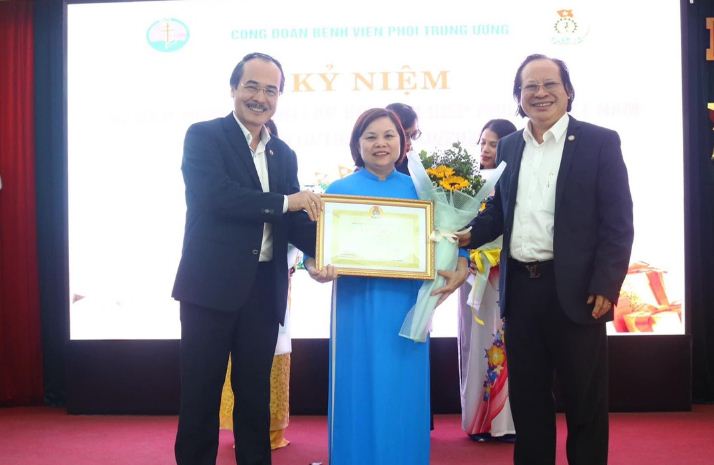 Ban Giám đốc Bệnh viện Phổi Trung ương trao Bằng khen Công đoàn Y tế Việt Nam cho BSCKII. Nguyễn Thị Ngoạn.