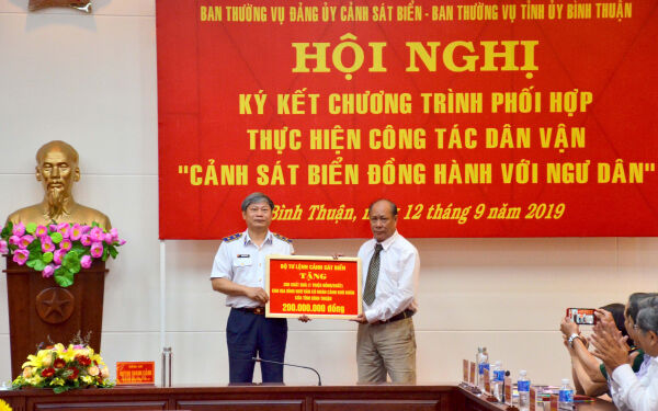 Tại Hội nghị, thay mặt Ban Thường vụ Đảng ủy Cảnh sát biển, Trung tướng Hoàng Văn Đồng, Bí thư Đảng ủy, Chính ủy Bộ Tư lệnh Cảnh sát biển và đồng chí Huỳnh Thanh Cảnh, Phó Bí thư Thường trực Tỉnh ủy thay mặt Ban Thường vụ Tỉnh ủy Bình Thuận đã ký kết Chương trình phối hợp thực hiện công tác dân vận “Cảnh sát biển đồng hành với ngư dân”. Trung tướng Hoàng Văn Đồng cho biết, lực lượng Cảnh sát biển Việt Nam là lực lượng chuyên trách của Nhà nước thực thi pháp luật trên biển, muốn hoàn thành được chức năng, nhiệm vụ được giao phải dựa vào cấp ủy, chính quyền và nhân dân địa phương, các cấp, các ngành, các lực lượng chức năng trong phối hợp thực hiện nhiệm vụ.