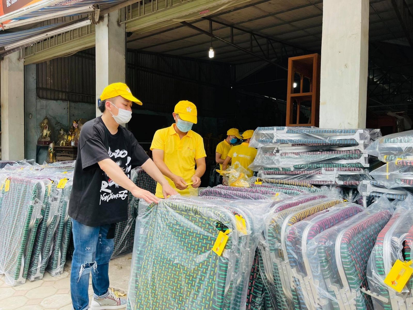Ca sĩ Tùng Dương (áo đen) và cộng sự chuyển giường xếp vào TP.HCM