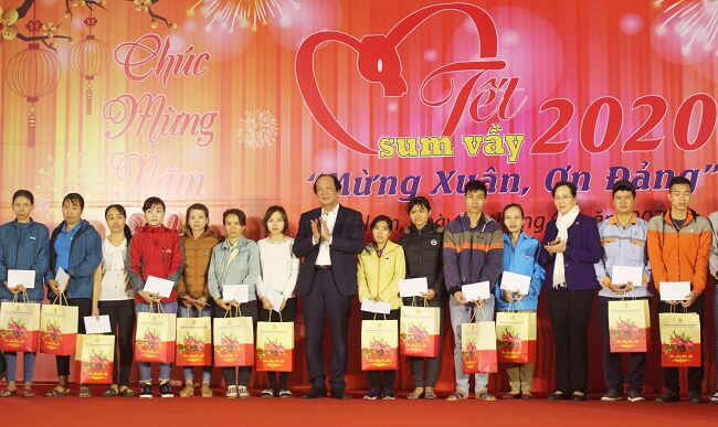 Bộ trưởng, Chủ nhiệm VPCP Mai Tiến Dũng và đồng chí Bí thư Tỉnh ủy Lê Thị Thủy tặng quà cho CNLĐ tại KCN Đồng Văn nhân dịp Tết sum vầy 2020
