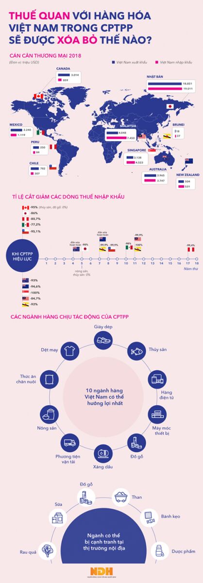 Về cơ bản, các cam kết về xóa bỏ và cắt giảm thuế quan nhập khẩu trong CPTPP được chia làm ba nhóm chính, gồm nhóm xóa bỏ thuế nhập khẩu ngay, nhóm xóa bỏ thuế nhập khẩu theo lộ trình và nhóm áp dụng hạn ngạch thuế quan.