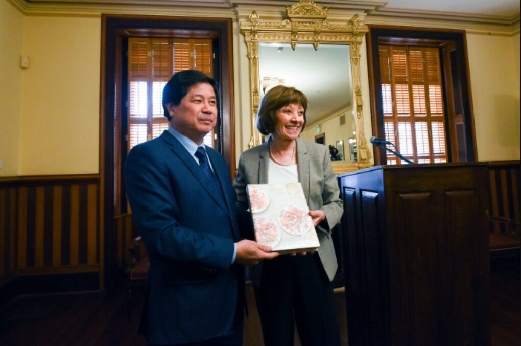 Thứ trưởng Lê Quốc Doanh và Bộ trưởng Nông nghiệp California Karen Ros trao quà lưu niệm.