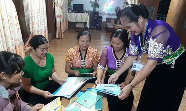 Chị Lò Thị Dơn tư vấn cho chị em trong bản về chính sách BHXH, BHYT