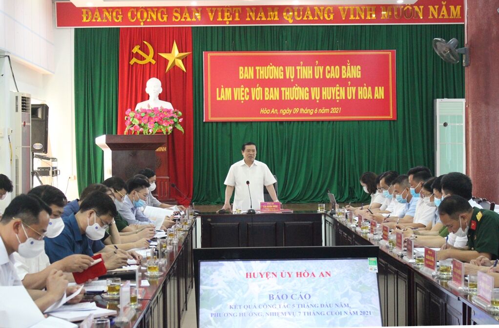 Đoàn công tác Ban Thường vụ Tỉnh ủy do đồng chí Lại Xuân Môn, Ủy viên Trung ương Đảng, Bí thư Tỉnh ủy, Trưởng Đoàn đại biểu Quốc hội tỉnh khóa XIV làm trưởng đoàn làm việc với Ban Thường vụ Huyện ủy Hòa An về tình hình thực hiện nhiệm vụ công tác 5 tháng đầu năm, phương hướng, nhiệm vụ 7 tháng cuối năm 2021. Cùng đi có các đồng chí trong Ban Thường vụ Tỉnh ủy và lãnh đạo các sở, ban, ngành.