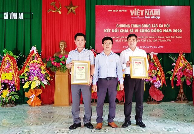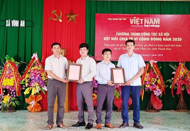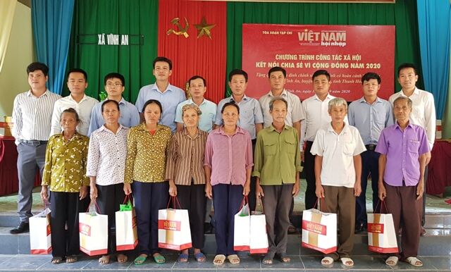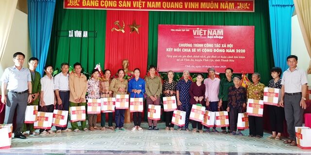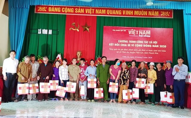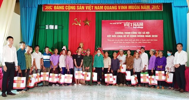 VNHN - Tiếp tục các hoạt động từ thiện theo kế hoạch đề ra, ngày 18/9/2020, Ban Kinh tế xã hội, Ban Công tác xã hội của Tòa soạn Việt Nam hội nhập đã kết nối với Công ty Cổ phần Đầu tư Sức Khỏe Cộng Đồng và một số doanh nghiệp địa phương tổ chức trao tặng 100 xuất quà trị giá 100 triệu đồng cho các gia đình chính sách, gia đình có hoàn cảnh khó khăn tại xã Vĩnh An, huyện Vĩnh Lộc, Thanh Hóa.