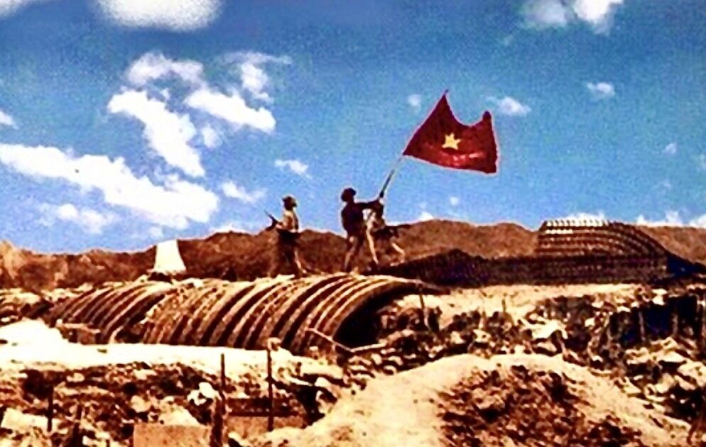 Chiều 7/5/1954, lá cờ "Quyết chiến - Quyết thắng" của Quân đội nhân dân Việt Nam tung bay trên nóc hầm tướng De Castries. Chiến dịch lịch sử Điện Biên Phủ đã toàn thắng. Ảnh: Tư liệu