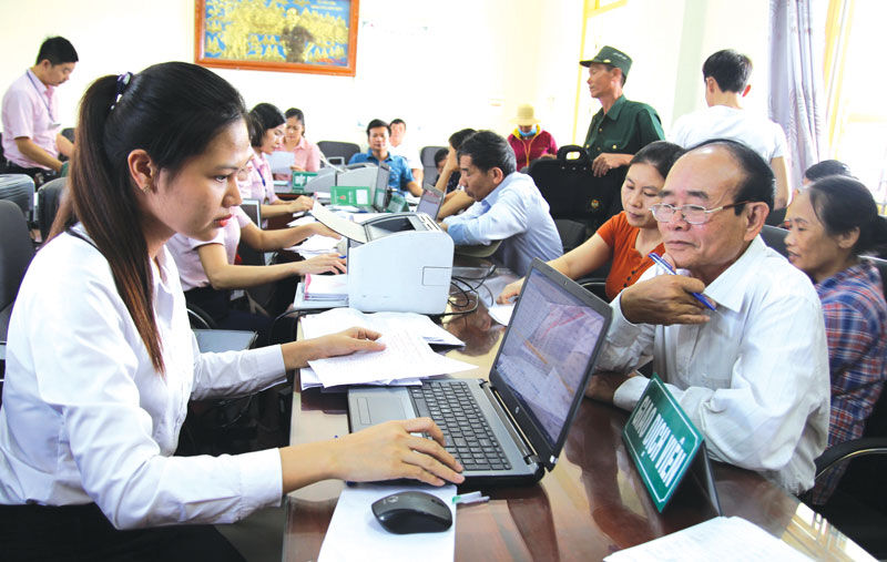 Cán bộ Ngân hàng Chính sách xã hội huyện hướng dẫn người dân thủ tục vay vốn tạo công ăn việc làm cho người dân.