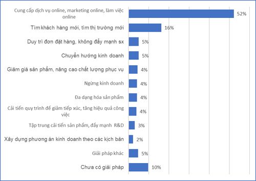 81% số doanh nghiệp cho biết có làm việc tại văn phòng tuân thủ đúng các quy định chống dịch theo khuyến cáo của Bộ Y tế. 52% số doanh nghiệp trả lời có sử dụng nền tảng internet để làm việc online, để cung cấp dịch vụ trực tuyến và để đẩy mạnh hoạt động marketing và bán hàng…