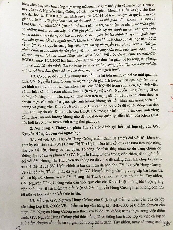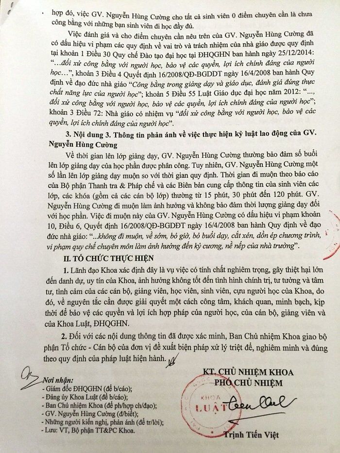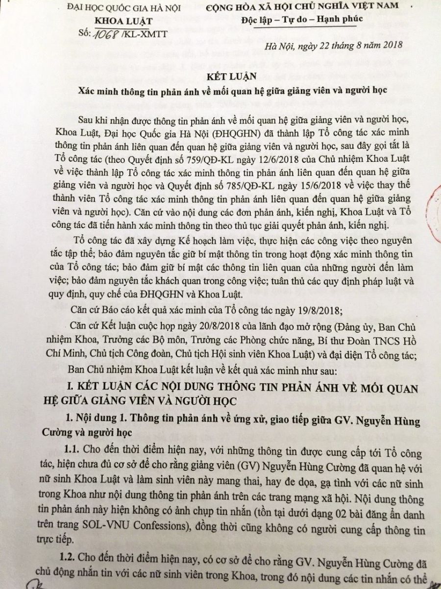 Thứ nhất, đối với thông tin phản ánh về ứng xử, giao tiếp giữa GV Nguyễn Hùng Cường và người học, văn bản cho biết: Cho đến thời điểm hiện tại không đủ cơ sở để cho rằng GV Nguyễn Hùng Cường đã quan hệ với nữ sinh khoa Luật và làm sinh viên này mang thai, hay đe dọa, gạ tình với các nữ sinh trong khoa. Tuy nhiên, việc GV Nguyễn Hùng Cường đã chủ động nhắn tin với các nữ sinh trong khoa, trong đó nội dung các tin nhắn có thể hiện cách ứng xử chưa đúng mực trong mối quan hệ giữa nhà giáo và người học đã được xác nhận là có cơ sở để khẳng định.