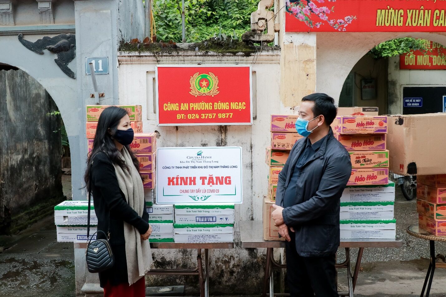 Đại diện Ciputra Hanoi trao tặng các nhu yếu phẩm cho Công an phường Đông Ngạc, Bắc Từ Liêm, Hà nội.