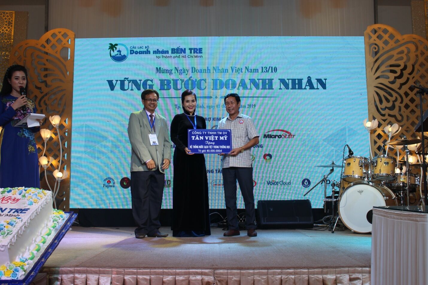 Doanh nhân Nguyễn Thị Xuân Mai - Tổng Thư ký BBC, Trưởng Ban LL đồng hương huyện Bình Đại tại TP. HCM nhận quà tài trợ là "Hệ thống nước sạch triệt trùng" trong trường học tại huyện Bình Đại, Bến Tre do công ty Tân Việt Mỹ trao tặng.
