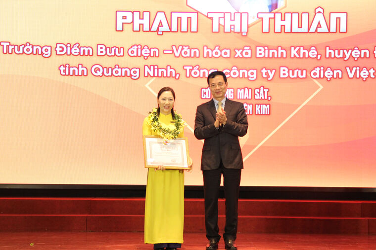Bộ trưởng trao Bằng khen cho chị Phạm Thị Thuân, Trưởng điểm Bưu điện văn hóa xã Bưu điện TX Đông Triều, Bưu điện tỉnh Quảng Ninh, Tổng Công ty Bưu điện Việt Nam
