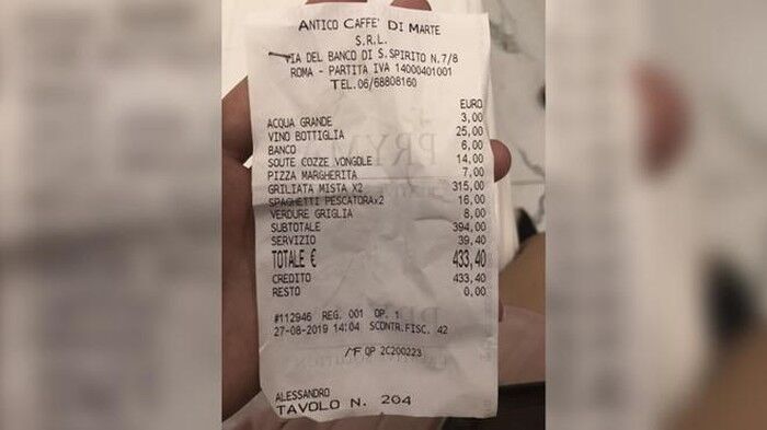 Bức ảnh về hóa đơn “khủng” từ nhà hàng Antico Caffè di Marte ở Castel Sant'Angelo đã gây dậy sóng trên mạng xã hội sau khi nó được đăng tải lên Facebook hồi đầu tháng 9. Ngoài 382 USD cho đồ ăn, các du khách Nhật nói trên phải trả thêm 88 USD tiền tip. Sau khi tấm hóa đơn gây nổi sóng trên mạng xã hội, nhiều người từng ăn ở nhà hàng này cũng lên tiếng tố cáo từng bị “chặt chém” tương tự.