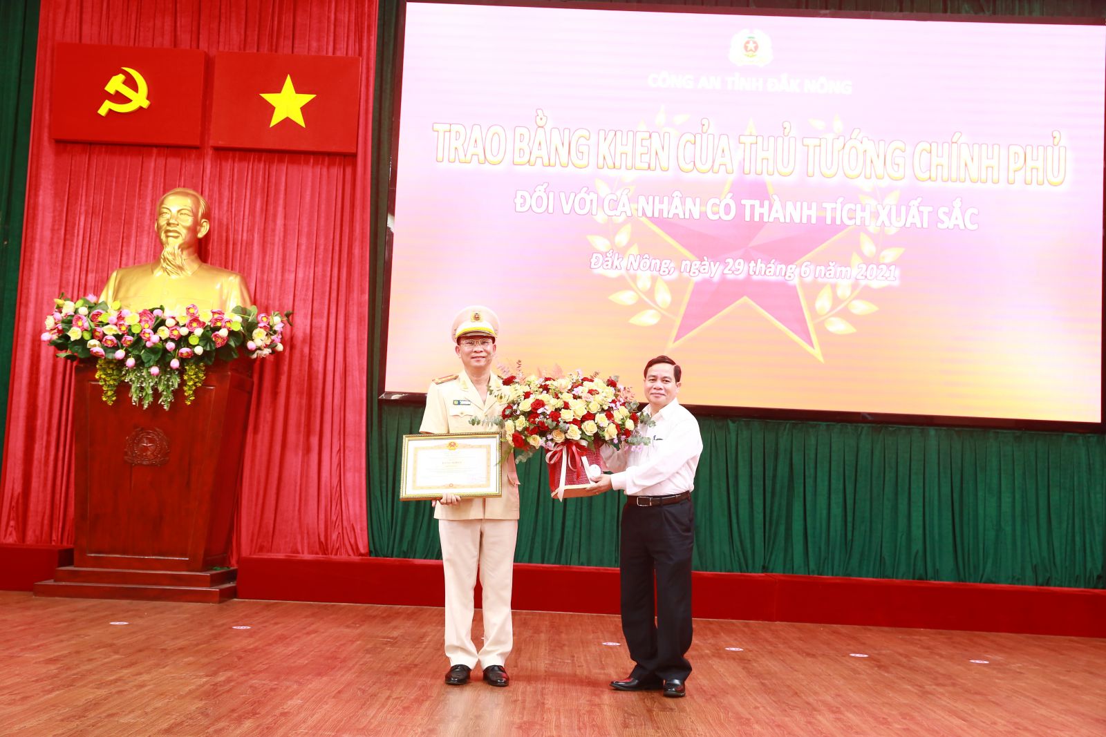 Thừa ủy quyền của Thủ tướng Chính phủ, đồng chí Điểu K’Ré, Phó Bí thư Tỉnh ủy trao bằng khen của Thủ tướng Chính phủ cho Đại tá Hồ Văn Mười, Giám đốc Công an tỉnh.
