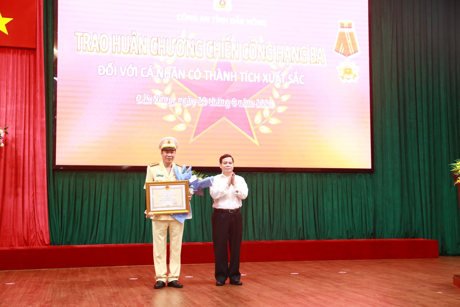 Thừa ủy quyền của Chủ tịch nước, đồng chí Điểu K’Ré, Phó Bí thư Tỉnh ủy trao Huân chương chiến công hạng ba cho Đại tá Hồ Quang Thắng, Phó Giám đốc Công an tỉnh.