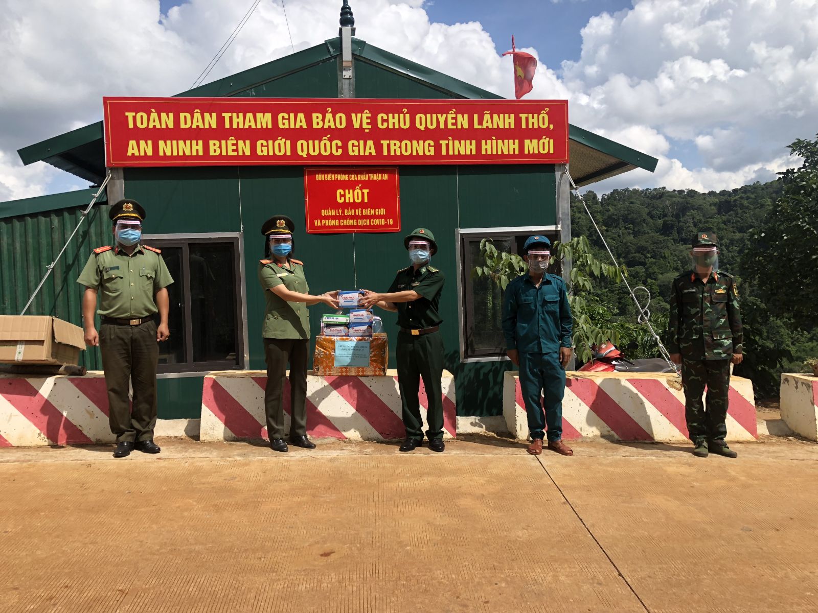 Đoàn Thanh niên – Hội phụ nữ Công an tỉnh Đắk Nông trao tặng quà cho lực lượng trực tiếp làm nhiệm vụ tại điểm chốt phòng, chống dịch ở xã biên giới Thuận An.