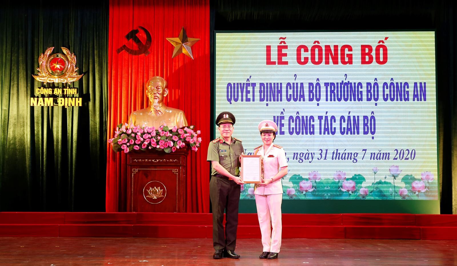 Thừa ủy quyền của Bộ trưởng Bộ Công an, Đại tá Phạm Văn Long, Giám đốc Công an tỉnh trao quyết định bổ nhiệm Thượng tá Phan Thị Loan (Ảnh: Công an tỉnh Nam Định)