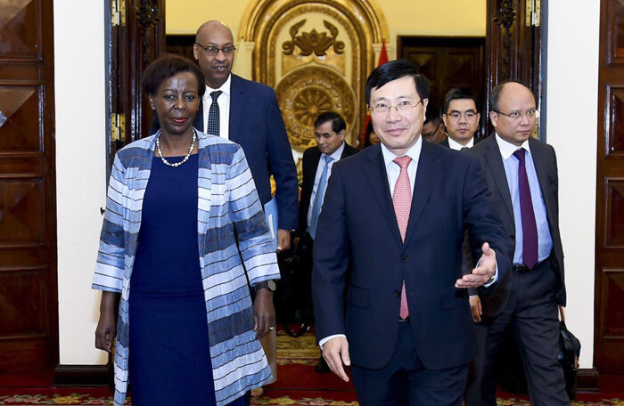 Phó Thủ tướng, Bộ trưởng Ngoại giao Phạm Bình Minh đón và hội đàm với Tổng Thư ký Tổ chức quốc tế Pháp ngữ Louise Mushikiwabo, tháng 12/2019