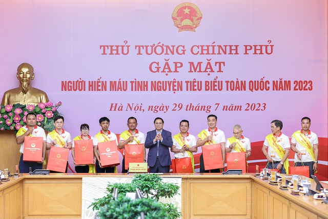 Chiều ngày 29/7, Thủ tướng Phạm Minh Chính gặp mặt 100 đại biểu là người hiến máu tình nguyện tiêu biểu toàn quốc năm 2023. Cùng tham dự cuộc gặp mặt có đồng chí Đào Hồng Lan, Bộ trưởng Bộ Y tế, Trưởng Ban Chỉ đạo Quốc gia Vận động hiến máu tình nguyện, lãnh đạo các bộ, ngành, cơ quan Trung ương.
