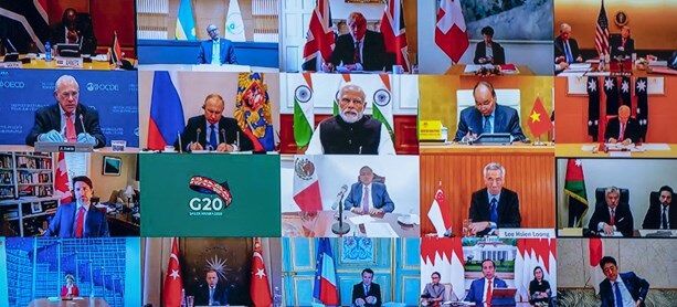 Toàn cảnh hội nghị trực tuyến Nhóm các nền kinh tế phát triển và mới nổi hàng đầu thế giới (G20) về dịch bệnh viêm đường hô hấp cấp COVID-19. Ảnh: AFP