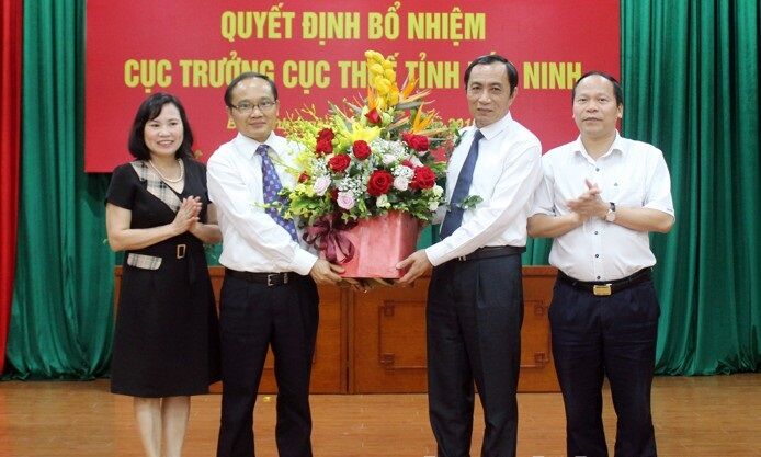 Phó Chủ tịch UBND tỉnh Nguyễn Văn Phong tặng hoa chúc mừng ông Ngô Xuân Tòng nhậm chức Cục trưởng Cục thuế Bắc Ninh.
