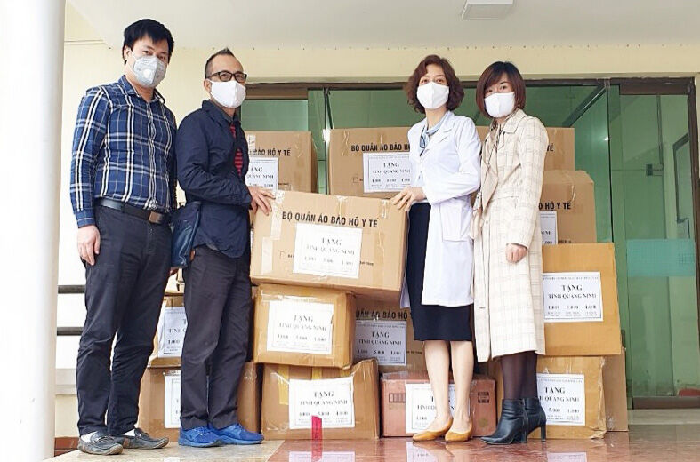 VNHN - Tiếp nối chuỗi xung kích đến các điểm tuyến đầu và vùng dịch, hôm nay (13/4), Công ty Cổ phần Khách sạn Hồng Vận đã trao tặng Tỉnh Quảng Ninh: 1.000 bộ quần áo bảo hộ, 8.000 khẩu trang vải kháng khuẩn, 15.000 đôi găng tay, 2.500 chai nước sát khuẩn góp phần chung tay cùng chính quyền và nhân dân Quảng Ninh phòng, chống dịch Covid-19.