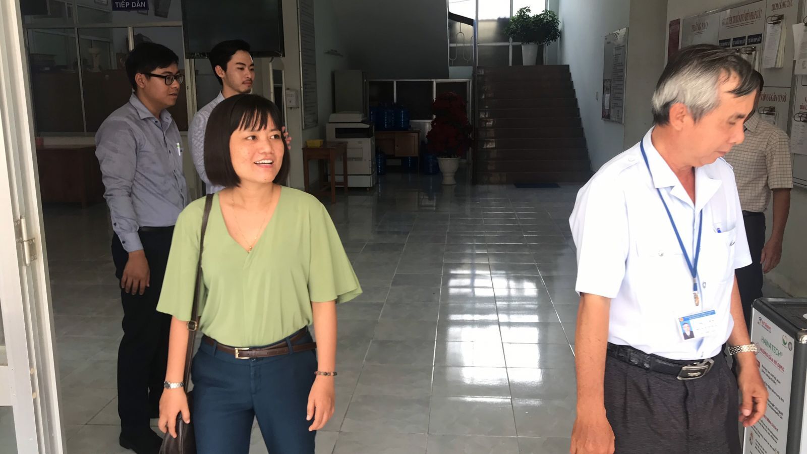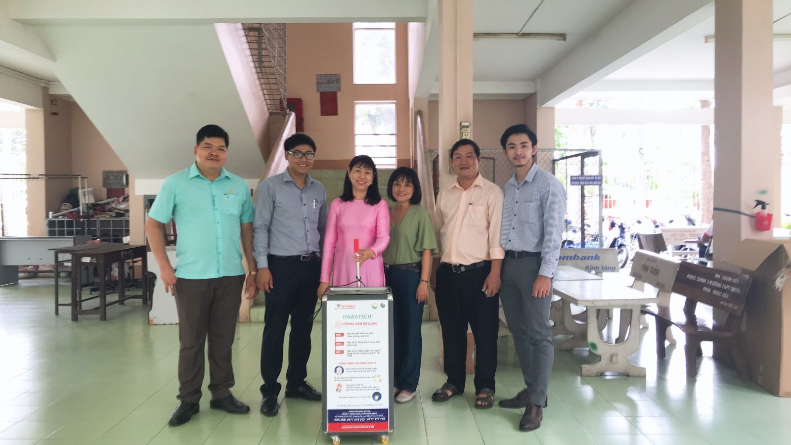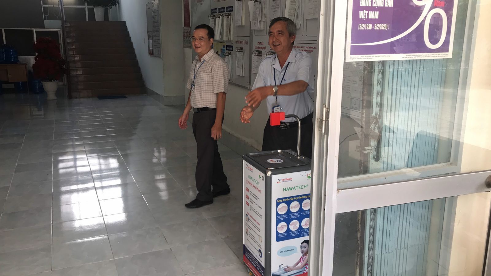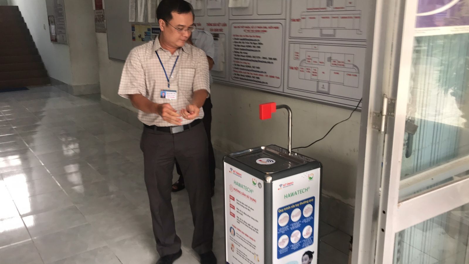 Lãnh đạo Sở Giáo dục & Đào tạo An Giang trải nghiệm với Máy rửa tay diệt khuẩn Hawatech.