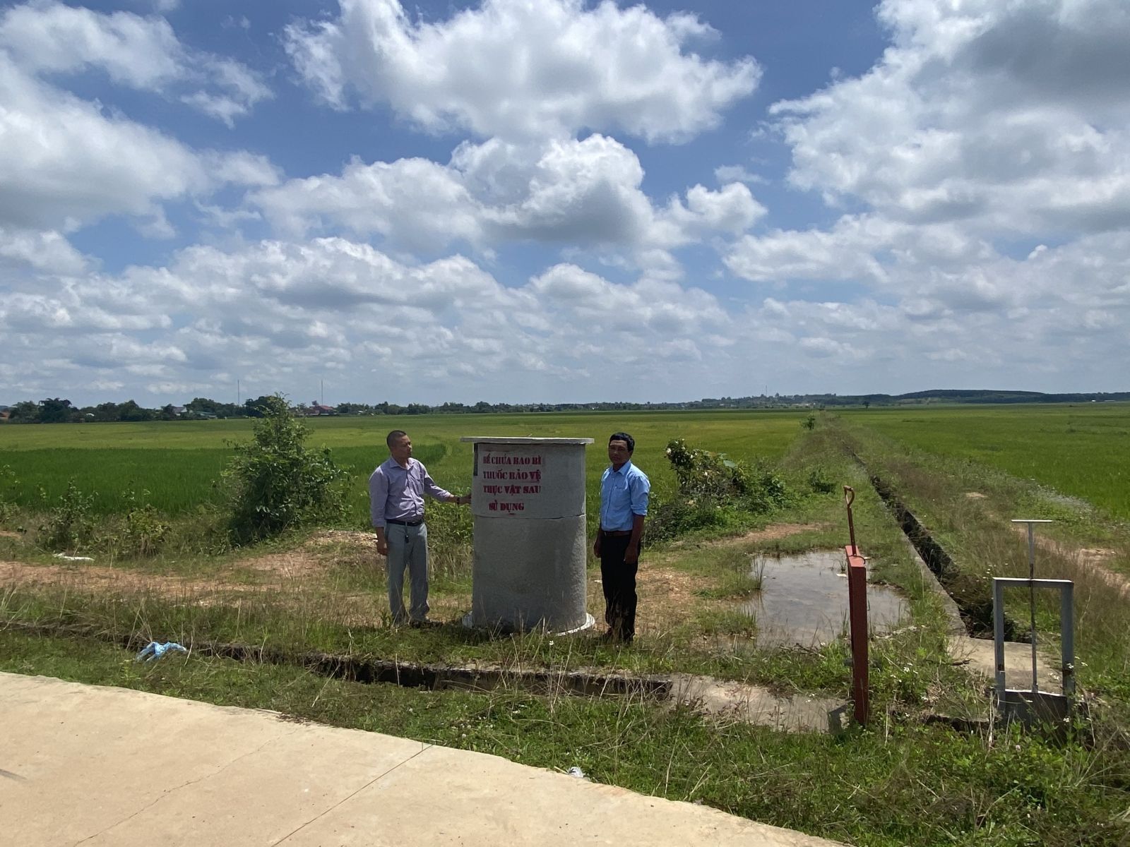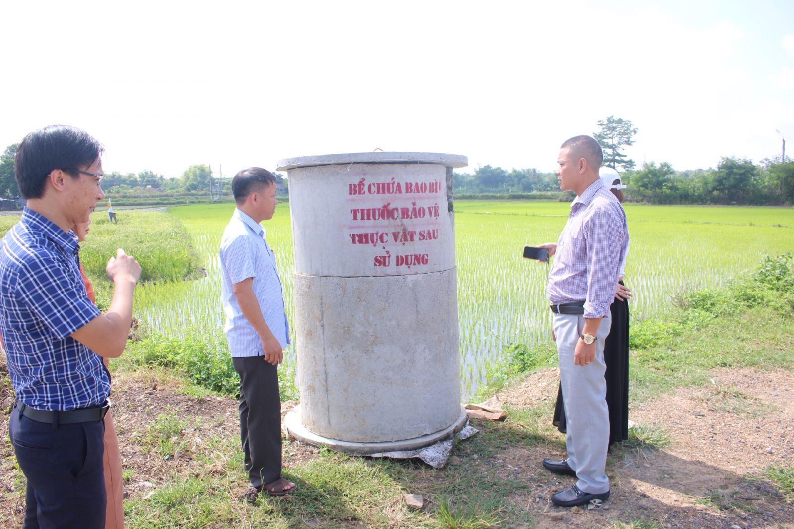 Ông Nguyễn Anh Đông, Trưởng phòng tài nguyên môi trường huyện Cư Jút đi thăm mô hình bể chứa rác thải nguy hại nông nghiệp thí điểm tại hai xã.
